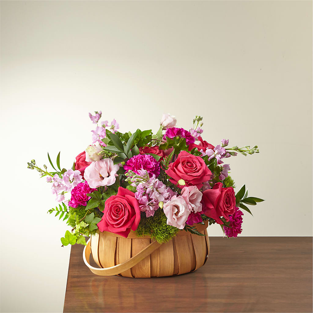 Inspired by bright shades and soft textures, this arrangement will wow your loved ones with its mix of roses, carnations, and lisianthus in a woven basket.